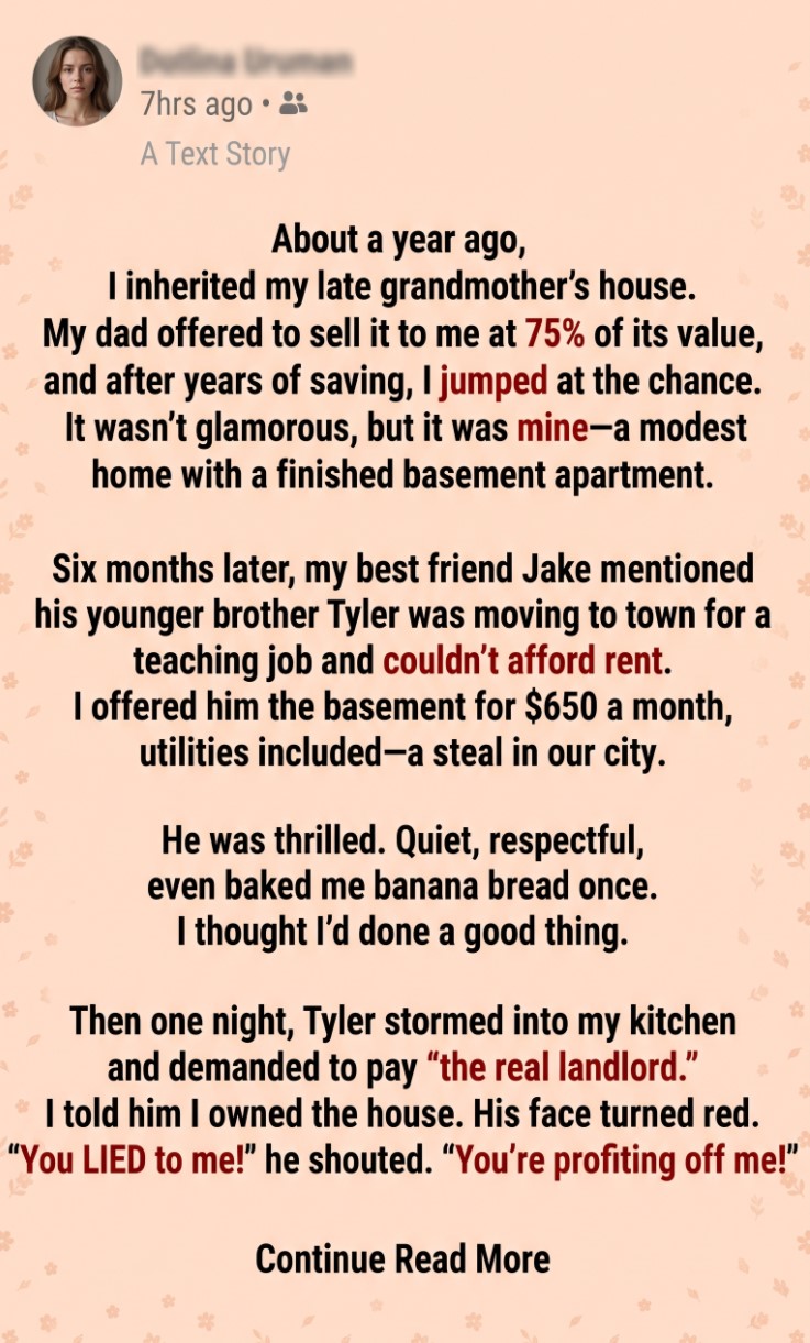 “Profiting off you?” I repeated slowly. “Tyler, you’re paying $650 a month. Utilities included. That barely covers the property tax and bills.”