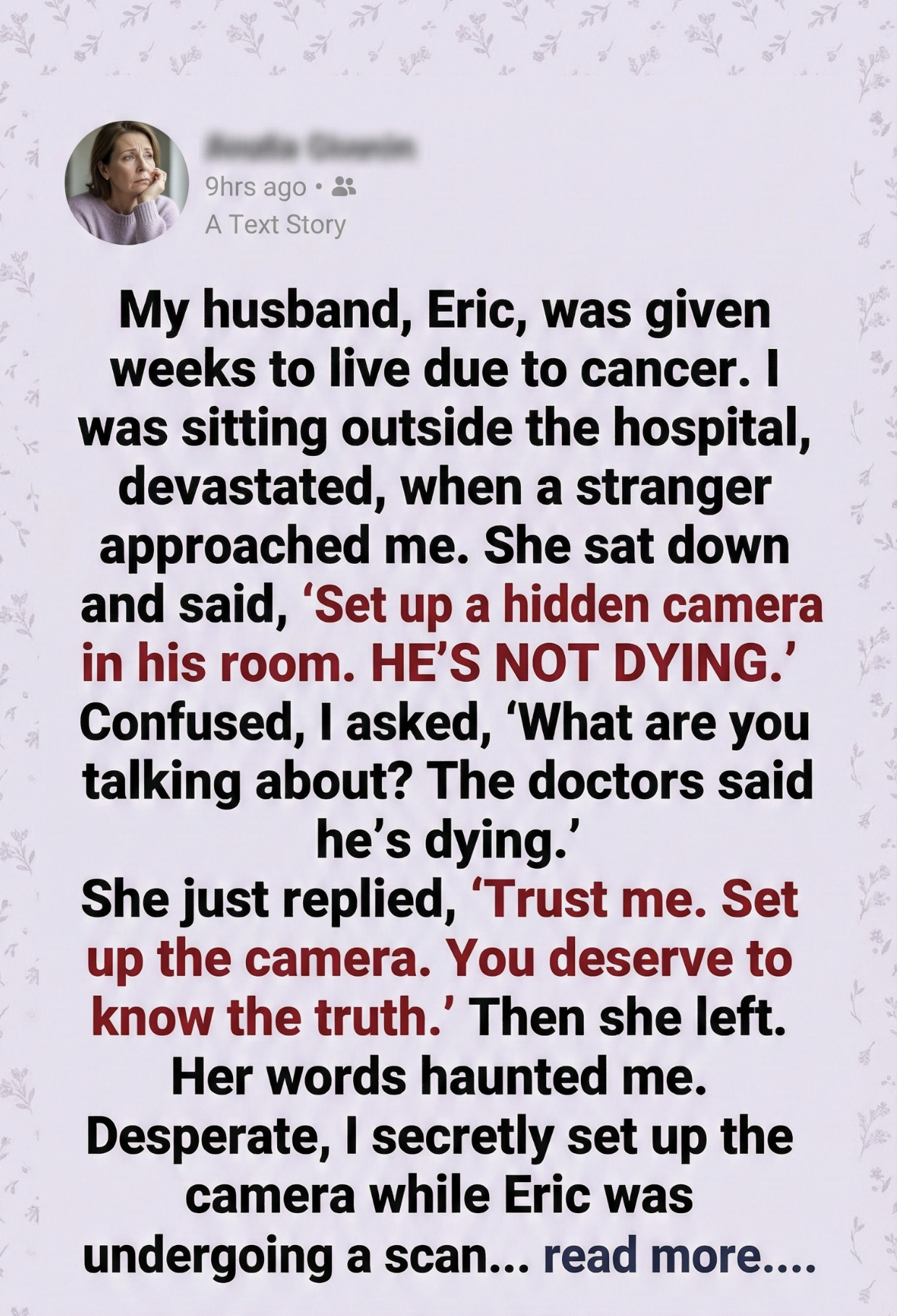 Her words haunted me. Desperate, I secretly set up the camera while Eric was undergoing a scan.