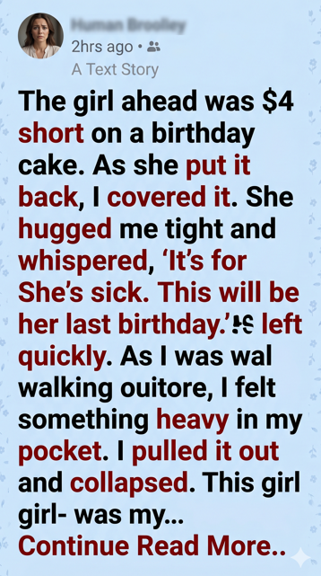 The girl at the checkout couldn’t have been more than ten. She held a small chocolate birthday cake with uneven frosting and plastic flowers. When the cashier announced the total, she opened her wallet—loose coins, a few wrinkled bills—and then froze.