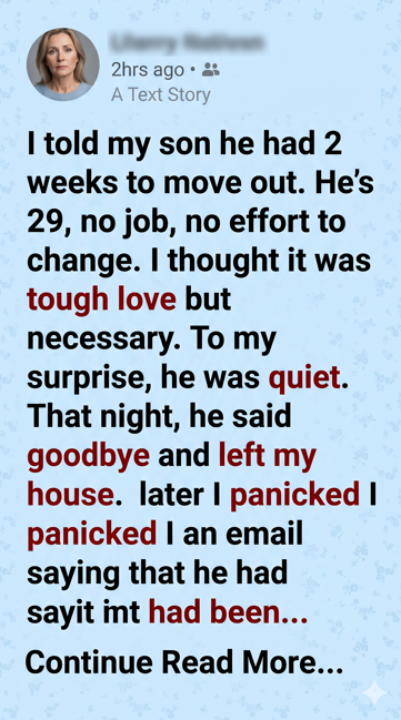 For years, I had watched him waste time, sleeping late, playing games, and ignoring every chance to build a future. I was frustrated and scared he would never change. That’s why I gave him those two weeks. I thought it was the only way.