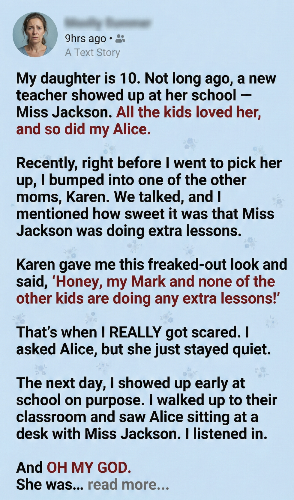 So when Miss Jackson started at Clearview Elementary, I was relieved. She had this way about her—young, maybe early thirties, stylish in that earthy kind of way, and always smiling like she knew something wonderful that hadn’t happened yet. Alice started talking about school more, and even wanted to get there early. She’d chatter away about “Miss J” and how she made class “less boring.”
