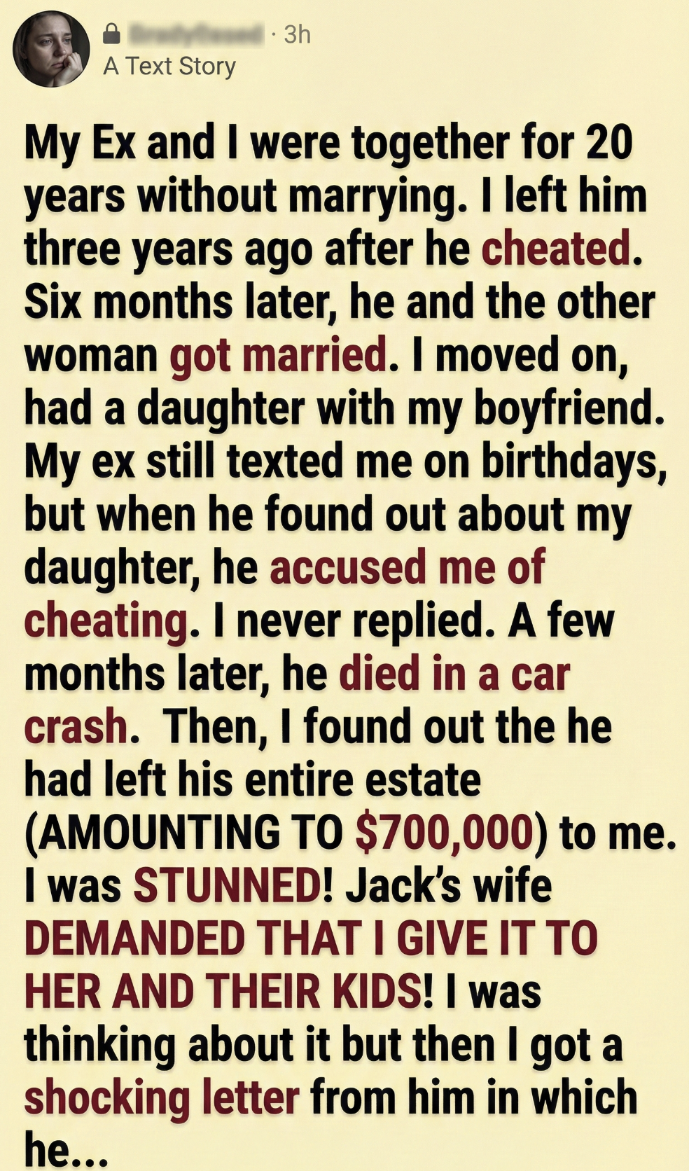 The debate has exploded online. Some call me selfish, others say I deserve it after 20 years of loyalty. One commenter wrote: “He cheated, but he still knew who truly stood by him. That’s why he left it to you.”