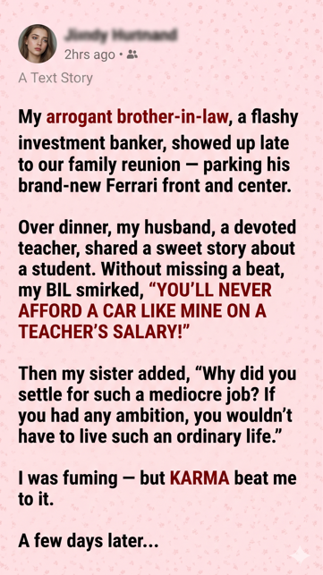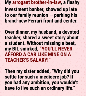 At a recent family reunion, my brother-in-law, Tom, a successful yet arrogant lawyer, decided to belittle my husband, David, a humble teacher. Tom’s wealth, flaunted through his flashy Ferrari, often made him the center of attention, and this year was no different.