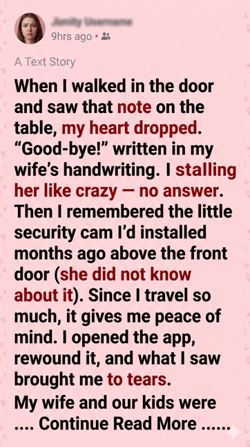 When I walked in the door and saw that note on the table, my heart dropped. āGood-bye!ā written in my wifeās handwriting. I started calling her like crazy āĀ no answer.Ā Then I remembered the little security cam Iād installed months ago above the front door (she did not know about it). Since I travel so much, it gives me peace of mind.