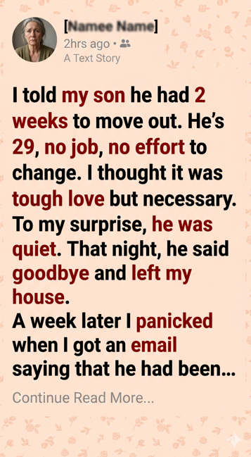 For years, I had watched him waste time, sleeping late, playing games, and ignoring every chance to build a future. I was frustrated and scared he would never change. That’s why I gave him those two weeks. I thought it was the only way.