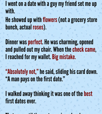 This was the same man who dramatically slid his card across the table and said, “A man pays on the first date.” The same man who refused to let me touch my wallet. The same man who made a whole speech about chivalry.