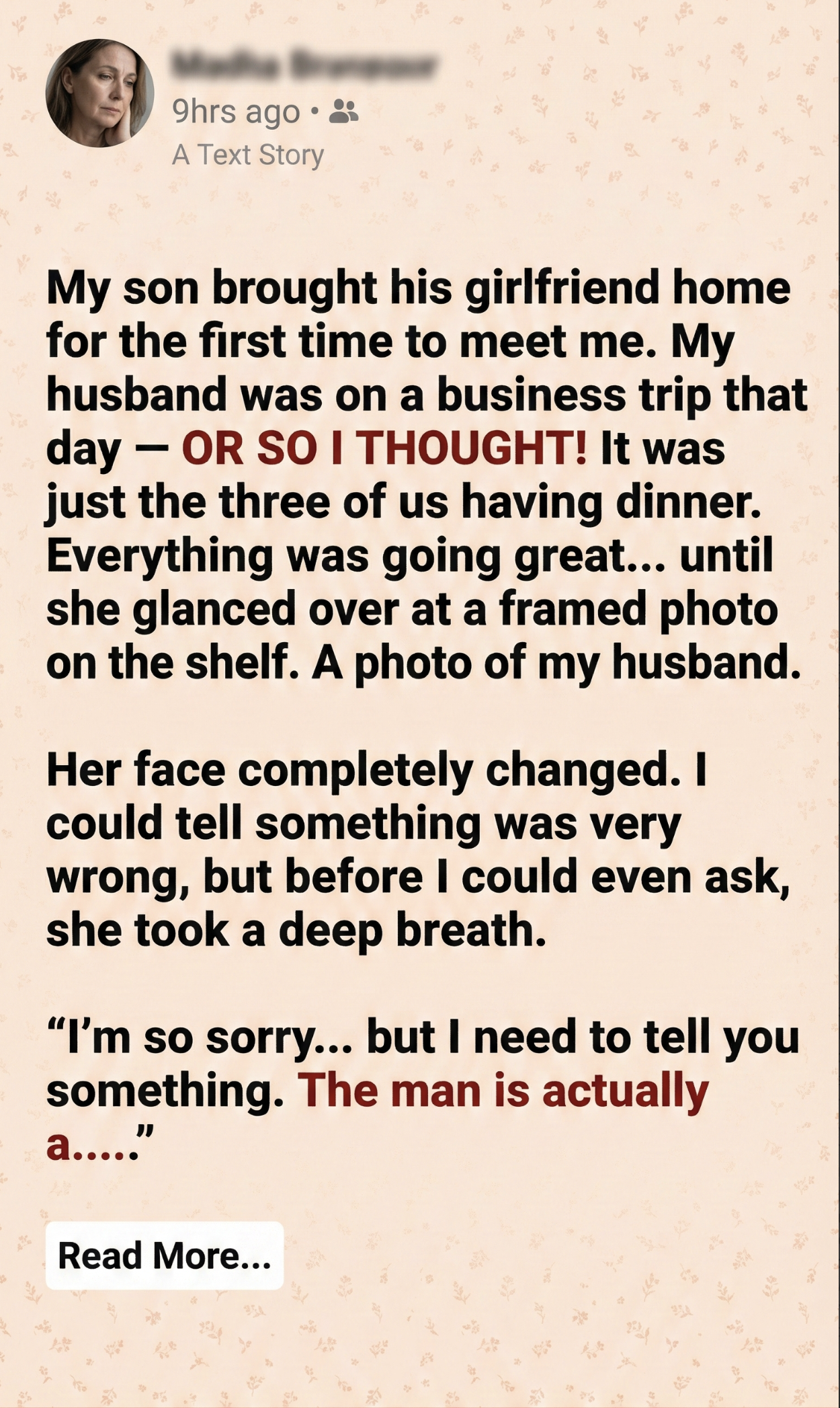 Laura thought meeting her son’s girlfriend would be a joyful milestone. Instead, one family photo exposed a devastating secret: Sophie recognized the man in the frame. He wasn’t just Ryan’s father—he was living a double life. What followed was a night of betrayal, confrontation, and the collapse of a twenty-year marriage.