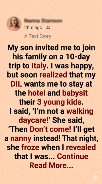 I’m Joyce, a 68-year-old retired widow. This past September, my son invited me to join his family for a 10-day vacation in Italy. At first, I was excited—thinking it would be a chance to reconnect, make memories, and feel part of their lives again.