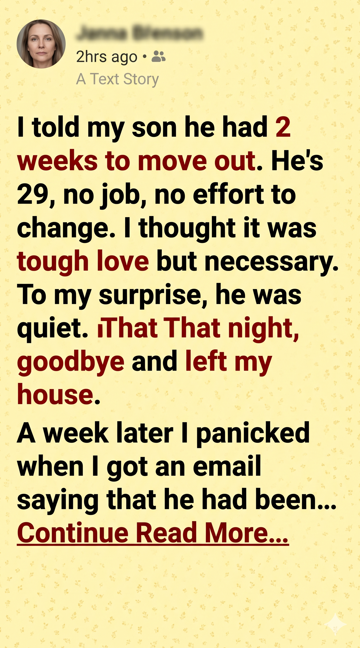 For years, I had watched him waste time, sleeping late, playing games, and ignoring every chance to build a future. I was frustrated and scared he would never change. That’s why I gave him those two weeks. I thought it was the only way.