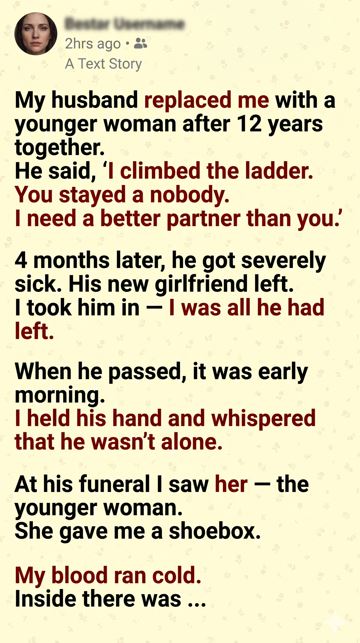 At the funeral, I noticed her—the younger woman—standing awkwardly at the edge of the crowd. Later, she approached, holding a small shoebox.