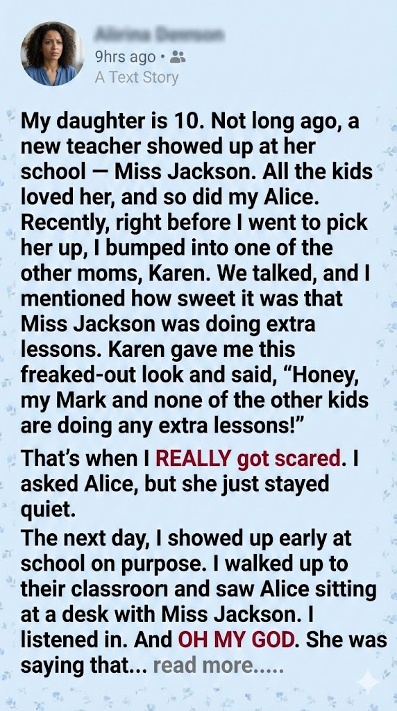 So when Miss Jackson started at Clearview Elementary, I was relieved. She had this way about her—young, maybe early thirties, stylish in that earthy kind of way, and always smiling like she knew something wonderful that hadn’t happened yet. Alice started talking about school more, and even wanted to get there early. She’d chatter away about “Miss J” and how she made class “less boring.”