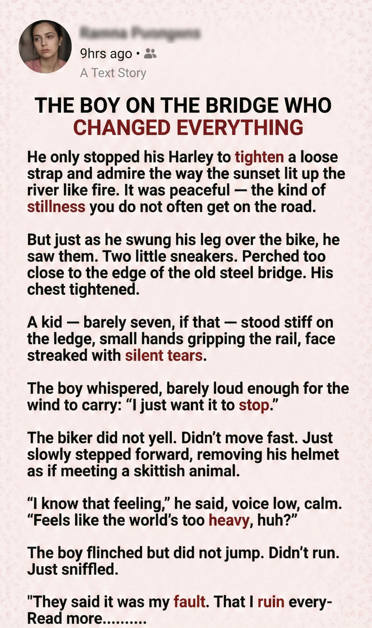 He stopped running that day. Jack ended up becoming a fierce advocate for the kid, working with social services to get him into a safe environment with an aunt who actually cared. He became the boy’s mentor, showing up to every baseball game, every graduation, every bad day, with that loud, rumbling Harley. The boy on the bridge grew up to be a counselor who saved hundreds of others, all because one stranger stopped to tighten a strap, saw the pain, and decided not to look away.