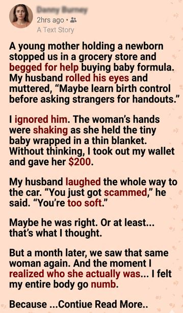 She explained that a month ago had been the worst day of her life. Her husband had suddenly passed away, and she had been left alone with a newborn and no nearby family. Her bank account had been temporarily frozen due to paperwork issues after his death, and she couldn’t access her money.