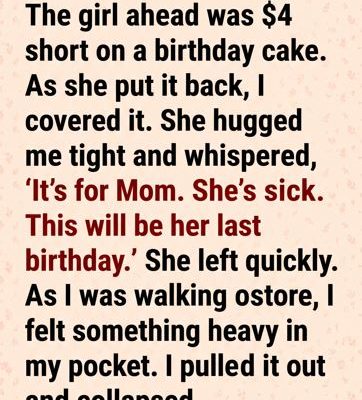 The girl at the checkout couldn’t have been more than ten. She held a small chocolate birthday cake with uneven frosting and plastic flowers. When the cashier announced the total, she opened her wallet—loose coins, a few wrinkled bills—and then froze.