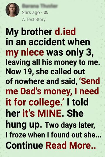 I kept seeing my brother’s face—the way he used to laugh, the way he held his little girl like she was his whole world. He hadn’t written a long will, just a simple one. Back then, I didn’t question it. Now, I wondered… did he trust me to keep it, or to protect it for her?