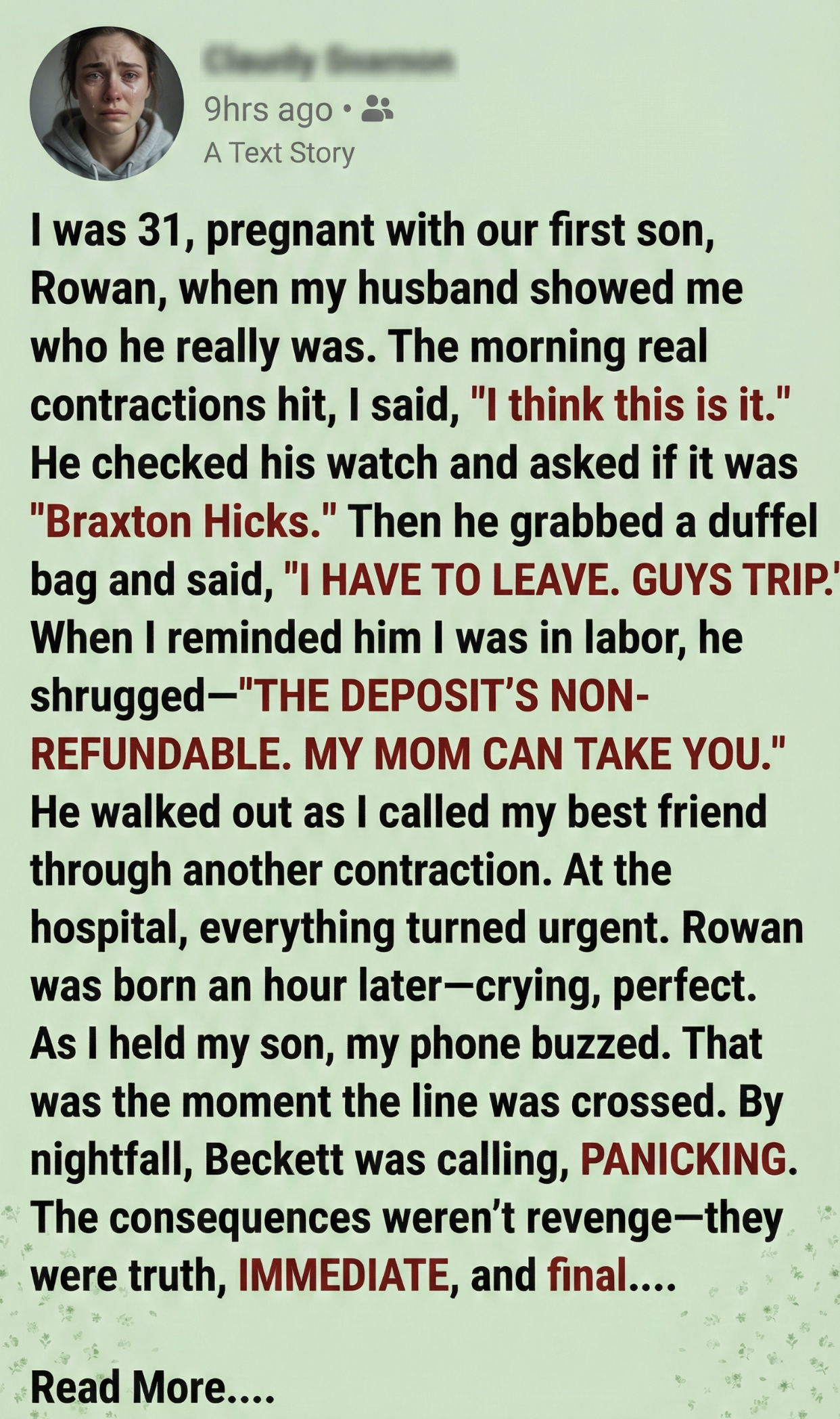“I’m in labor,” I panted. “Real labor. Beckett just left for a guys’ trip. He said his mom would take me.”
