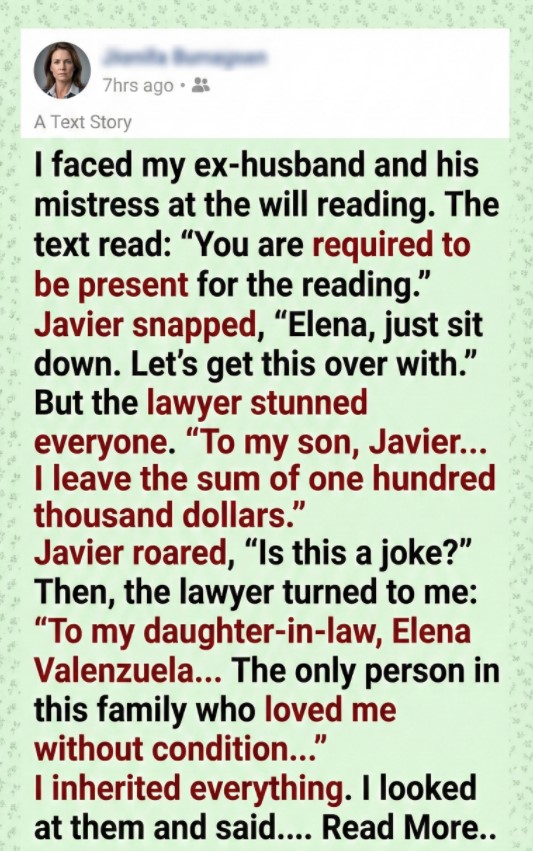 The heavy oak door of the notary’s office felt like a barrier between two worlds, separating the quiet sanity of the hallway from the suffocating toxicity waiting inside, yet I walked through it knowing that my ex-husband, his mistress, and his mother would be waiting like vultures circling a carcass. I showed up anyway, not because I wanted to see the faces that had haunted my nightmares for the past year, nor because I missed the life I had violently lost, but because the message on my phone had made my stomach drop with a command I couldn’t ignore: “You are required to be present for the reading.” When I finally stepped into the room, the air was thick with the scent of expensive leather and old paper, a smell that usually comforted me but today made me nauseous. I didn’t sit down in the empty chair they had left for me; instead, I stayed standing near the bookshelf with my arms crossed tight against my chest, as if keeping my body rigid enough would prevent my heart from betraying the anxiety thundering against my ribs. The lawyer, Gavin Herrera, looked up from his desk, adjusted his wire-rimmed glasses, and spoke with a professional calm that contrasted sharply with the tension in the room, looking directly at me to say, “Mrs. Valenzuela… I’m glad you decided to join us.”