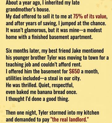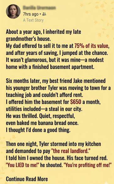 “Profiting off you?” I repeated slowly. “Tyler, you’re paying $650 a month. Utilities included. That barely covers the property tax and bills.”