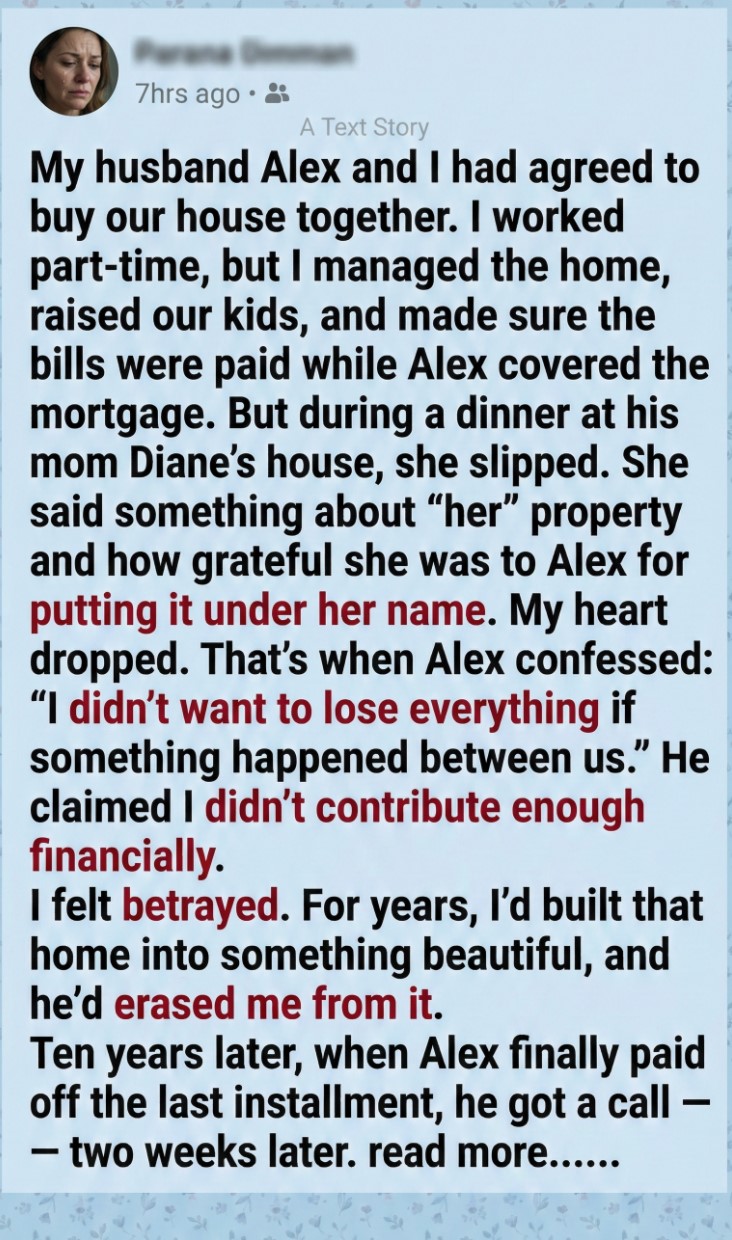 My husband Alex and I had agreed to buy our house together. I worked part-time, but I managed the home, raised our kids, scheduled doctor appointments, helped with homework, cooked, cleaned, and made sure every single bill—except the mortgage—was paid on time. Alex covered the mortgage. That was our arrangement. Or so I thought.