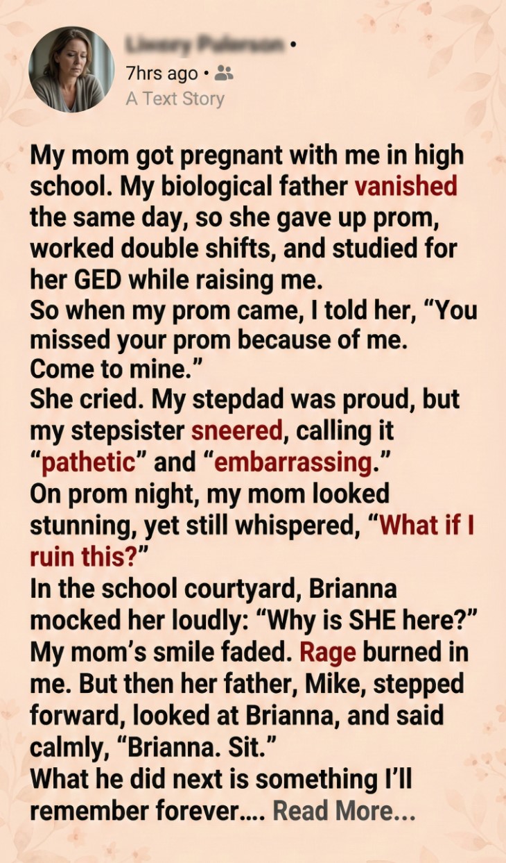 On prom night, she came down the stairs in a simple navy-blue dress. Nothing flashy. Nothing dramatic. But she looked stunning. Confident. Beautiful in a way that had nothing to do with age.