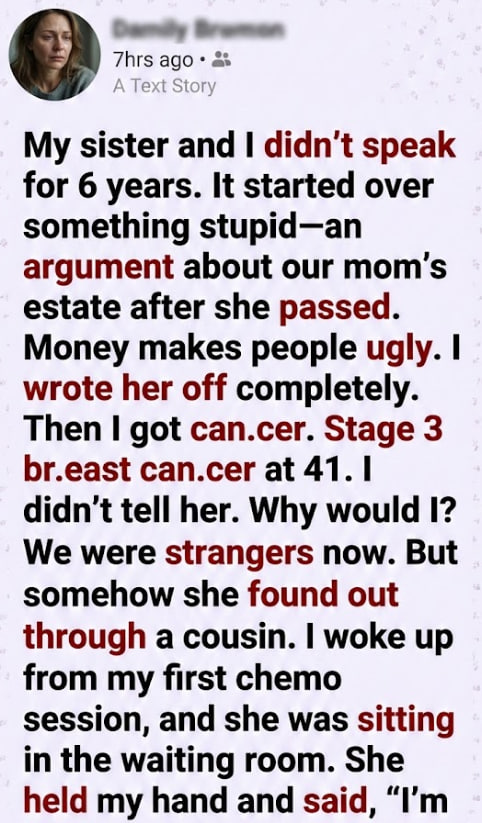 She sat hunched forward in a waiting chair, hair pulled back the same way she wore it as a child when we were late for school. Her eyes were red and swollen. She looked hollowed out in a way that spoke of more than lost sleep.