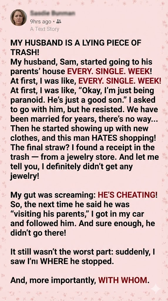 My husband, Sam, started going to his parents’ house EVERY. SINGLE. WEEK! At first, I was like, EVERY. SINGLE. WEEK! At first, I was like, “Okay, I’m just being paranoid. He’s just a good son.” I asked to go with him, but he resisted. We have been married for years, there’s no way… Then he started showing up with new clothes, and this man HATES shopping! The final straw? I found a receipt in the trash — from a jewelry store. And let me tell you, I definitely didn’t get any jewelry!