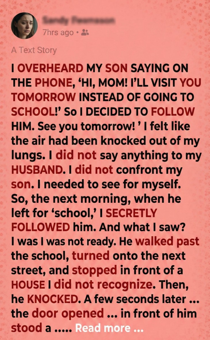 I OVERHEARD MY SON SAYING ON THE PHONE, ‘HI, MOM! I’LL VISIT YOU TOMORROW INSTEAD OF GOING TO SCHOOL!’ So I DECIDED TO FOLLOW HIM. See you tomorrow! ’ I felt like the air had been knocked out of my lungs. I did not say anything to my husband. I did not confront my son. I needed to see for myself. So, the next morning, when he left for ‘school,’ I secretly followed him. And what I saw? I was not ready. He walked past the school, turned onto the next street, and stopped in front of a house I did not recognize. Then, he knocked. A few seconds later … the door opened … in front of him stood a …..