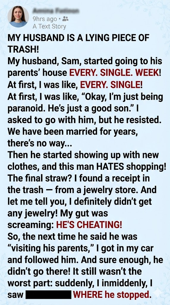 My husband, Sam, started going to his parents’ house EVERY. SINGLE. WEEK! At first, I was like, “Okay, I’m just being paranoid. He’s just a good son.” I asked to go with him, but he resisted. We have been married for years, there’s no way…