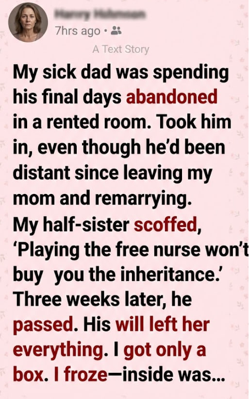 By chance, I learned that my father had spent his last weeks alone in a tiny rented room on the edge of town. A neighbor mentioned it casually—an older man who rarely ventured outside, with no visitors. When I heard his name, my chest tightened.