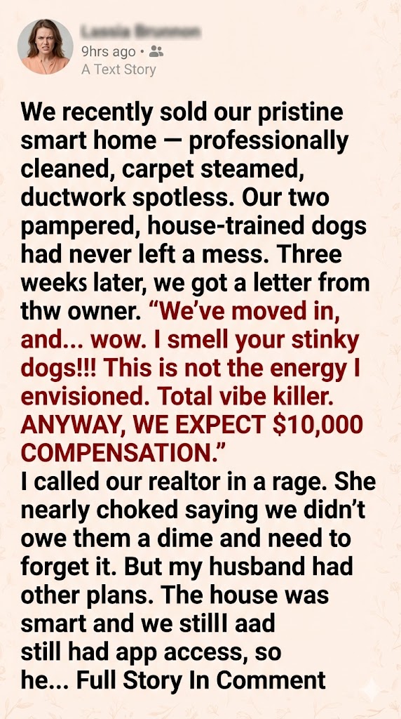 Three weeks later, we got a letter from the owner. “We’ve moved in, and… wow. I smell your stinky dogs!!! This is not the energy I envisioned. Total vibe killer. ANYWAY, WE EXPECT $10,000 COMPENSATION.”