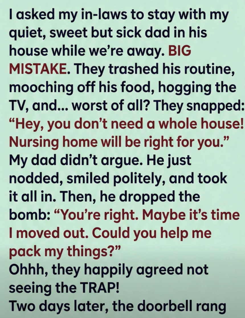 Three days before our return, he told them, “You’re right. Maybe it’s time I moved out. Could you help me pack?” They lit up, smug and excited. For two days, they boxed his clothes, books, and photos, already dreaming of redecorating. Bob imagined a media room; Janet planned new curtains.