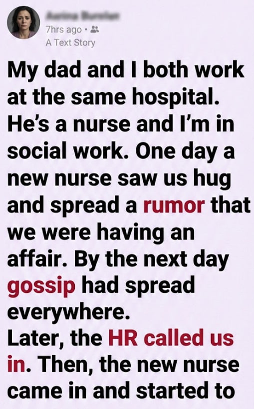 That comfort became the spark for chaos. A new nurse witnessed one of our hugs and misinterpreted it, seeing a scandal instead of a father-daughter moment. By the next day, whispers spread like wildfire. Colleagues looked at us differently, and the hospital—a place that felt like a second home—suddenly felt like a minefield of judgment.