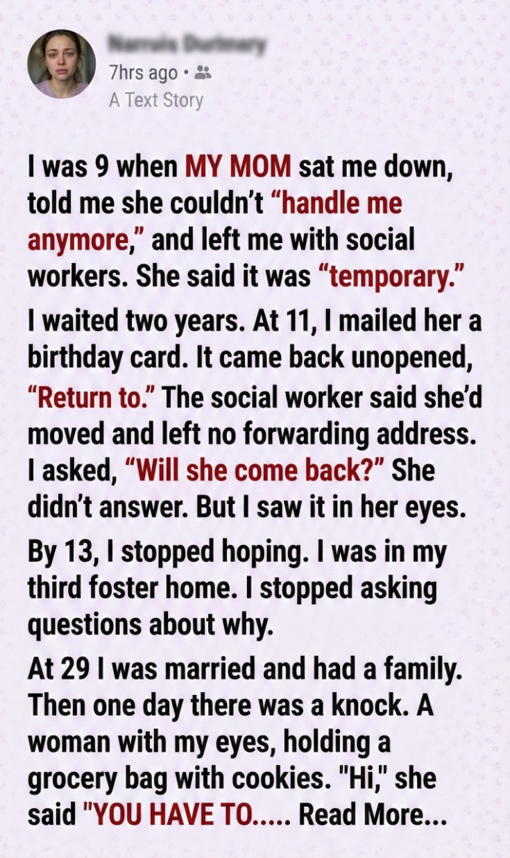 One evening, after putting Emma to bed, I heard it—knock, knock, knock. On the porch stood a frail woman with gray hair, clutching a grocery bag of cookies. Her eyes stopped me cold. They were my eyes.
