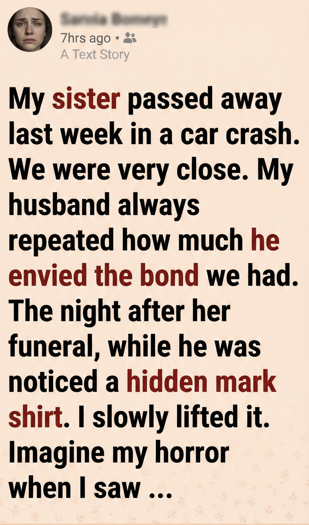 My sister passed away last week in a car crash. We were very close. My husband always repeated how much he envied the bond we had.
