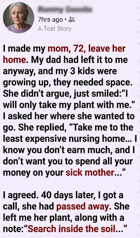 The day she left, she walked out slowly, carrying nothing but a small, worn bag and that green potted plant she’d watered every morning for years. I didn’t help her to the car. I told myself she was strong enough. I told myself I’d visit soon.