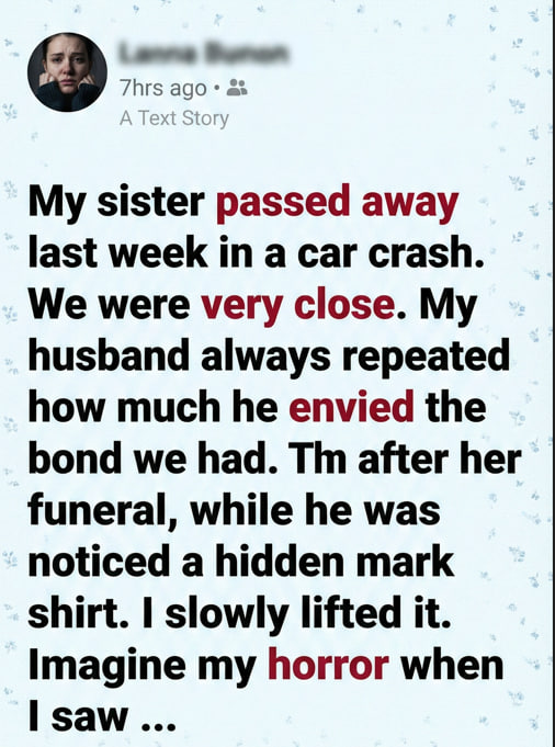 My sister passed away last week in a car crash. We were very close. My husband always repeated how much he envied the bond we had.