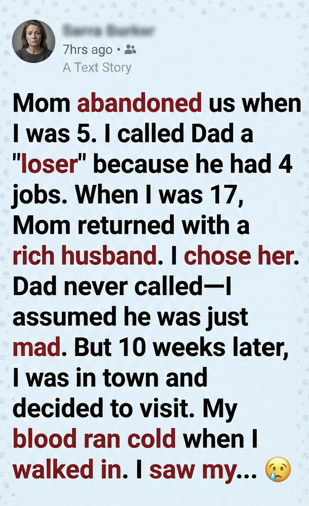 When I saw him, tubes everywhere, face pale and thinner than I remembered, my knees nearly gave out. I broke down, sobbing, begging him to forgive me for leaving. For choosing my mother. For calling him a loser.