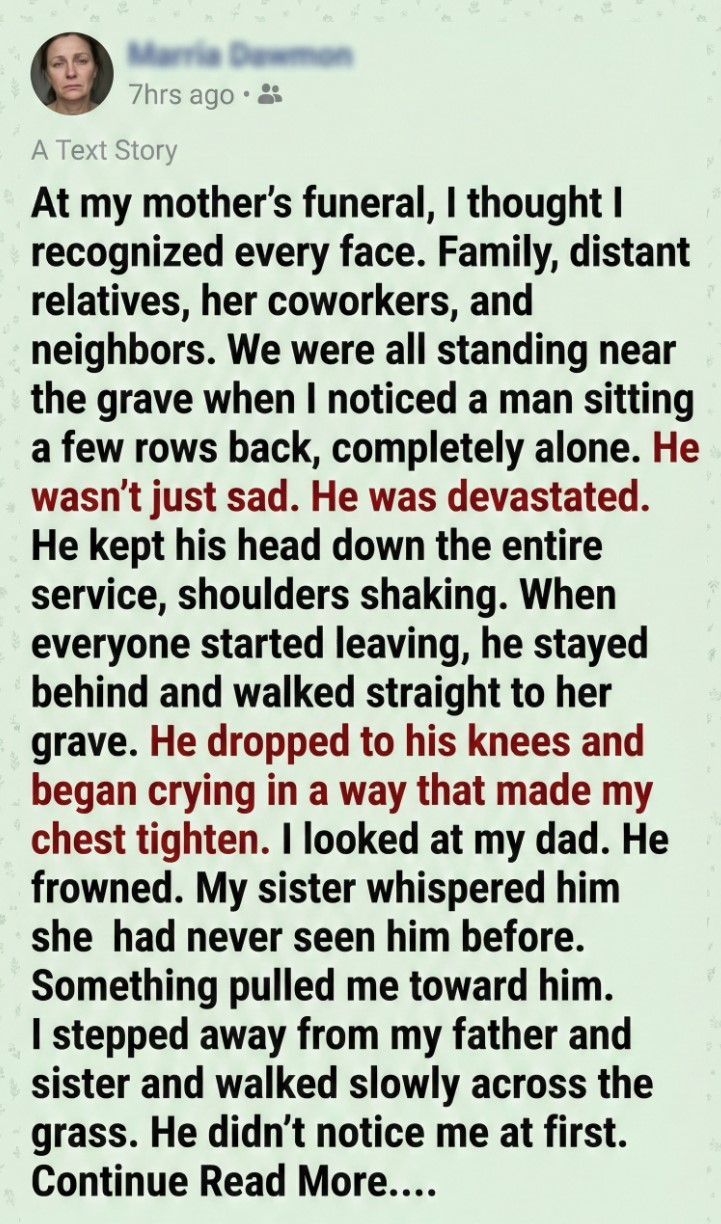 At my mother’s funeral, I thought I recognized every face. Family, distant relatives, her coworkers, and neighbors. We were all standing near the grave when I noticed a man sitting a few rows back, completely alone.