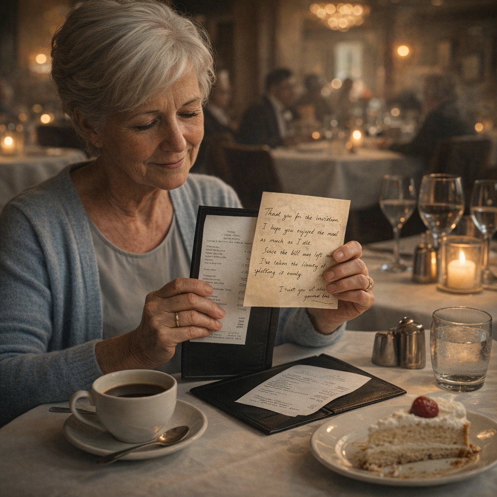 The waiter approached gently and placed the bill in front of her, clearly unsure of what to say. He’d seen this before.