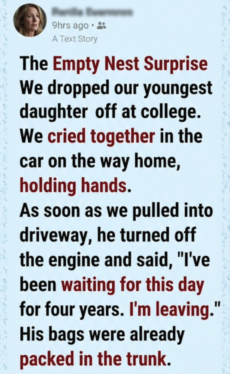 He hadn’t packed them while I was sleeping. He had packed them before we even left for the college drop-off. While I was worrying about Chloe’s meal plan, he was carefully folding his shirts for a life without me. He had driven our daughter to her future with his own escape route sitting right behind the back seat.