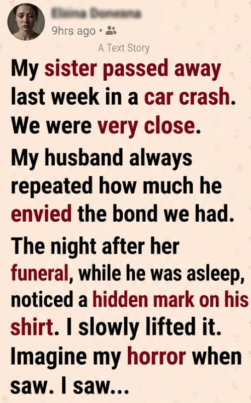 My sister passed away last week in a car crash. We were very close. My husband always repeated how much he envied the bond we had.