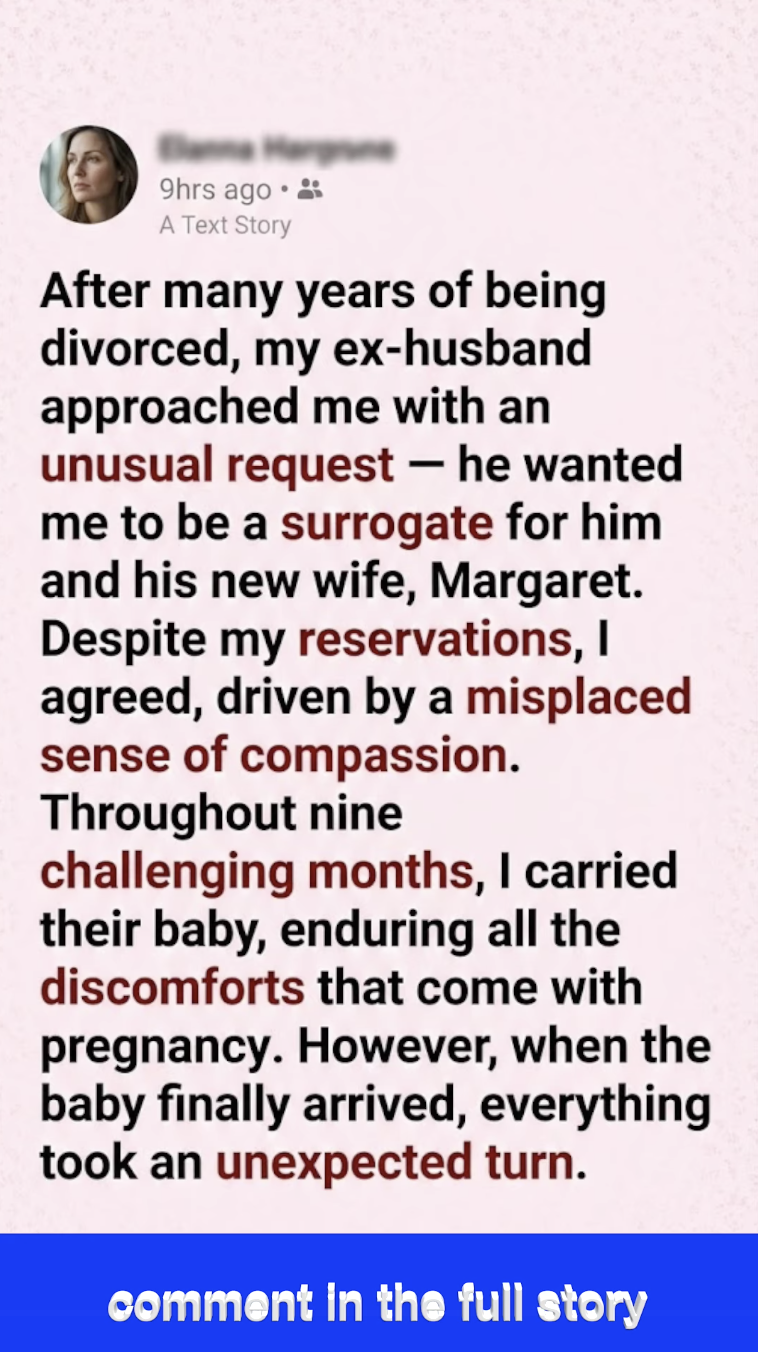 Five years after our divorce, my ex-husband, Mark, showed up at my door in tears. He told me his new wife, Margaret, couldn’t carry a child, and they were desperate. He said I was the only person he trusted to carry their legacy. It was an unusual request, to say the least.
