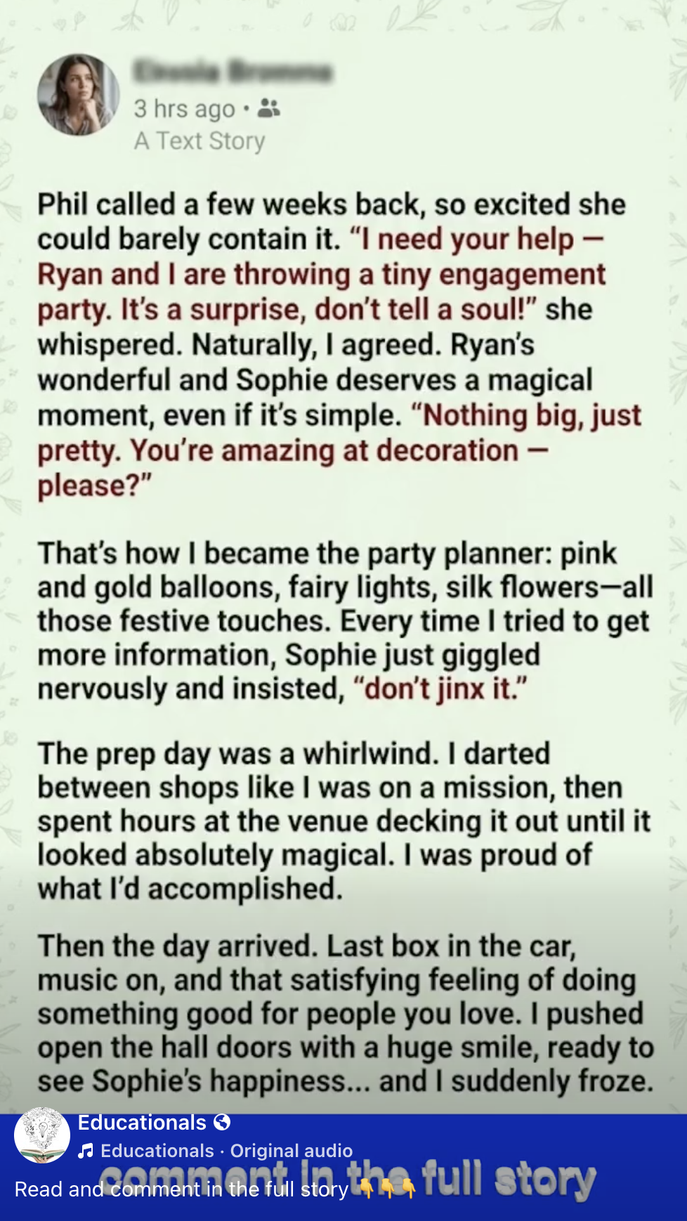 That’s how I became the party planner: pink and gold balloons, fairy lights, silk flowers—all those festive touches. Every time I tried to get more information, Sophie just giggled nervously and insisted, “don’t jinx it”. I thought she was just nervous about the engagement. I didn’t realize she was nervous about me.