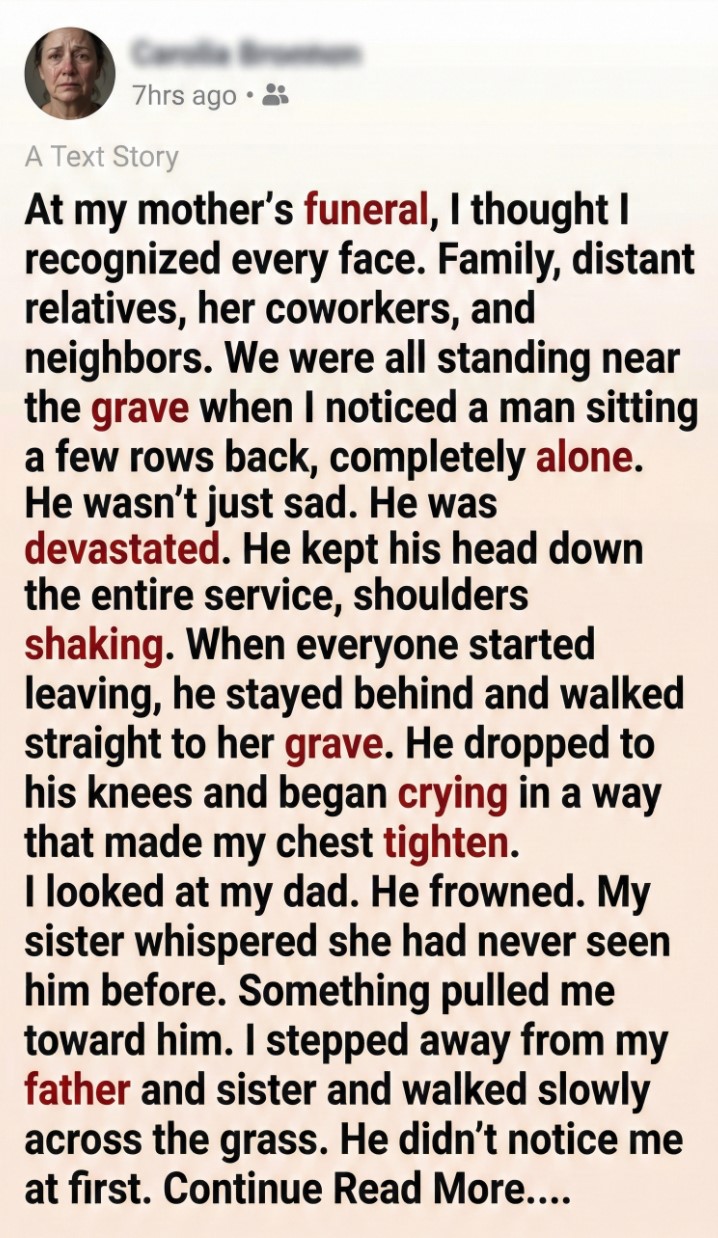 At my mother’s funeral, I thought I recognized every face. Family, distant relatives, her coworkers, and neighbors. We were all standing near the grave when I noticed a man sitting a few rows back, completely alone.
