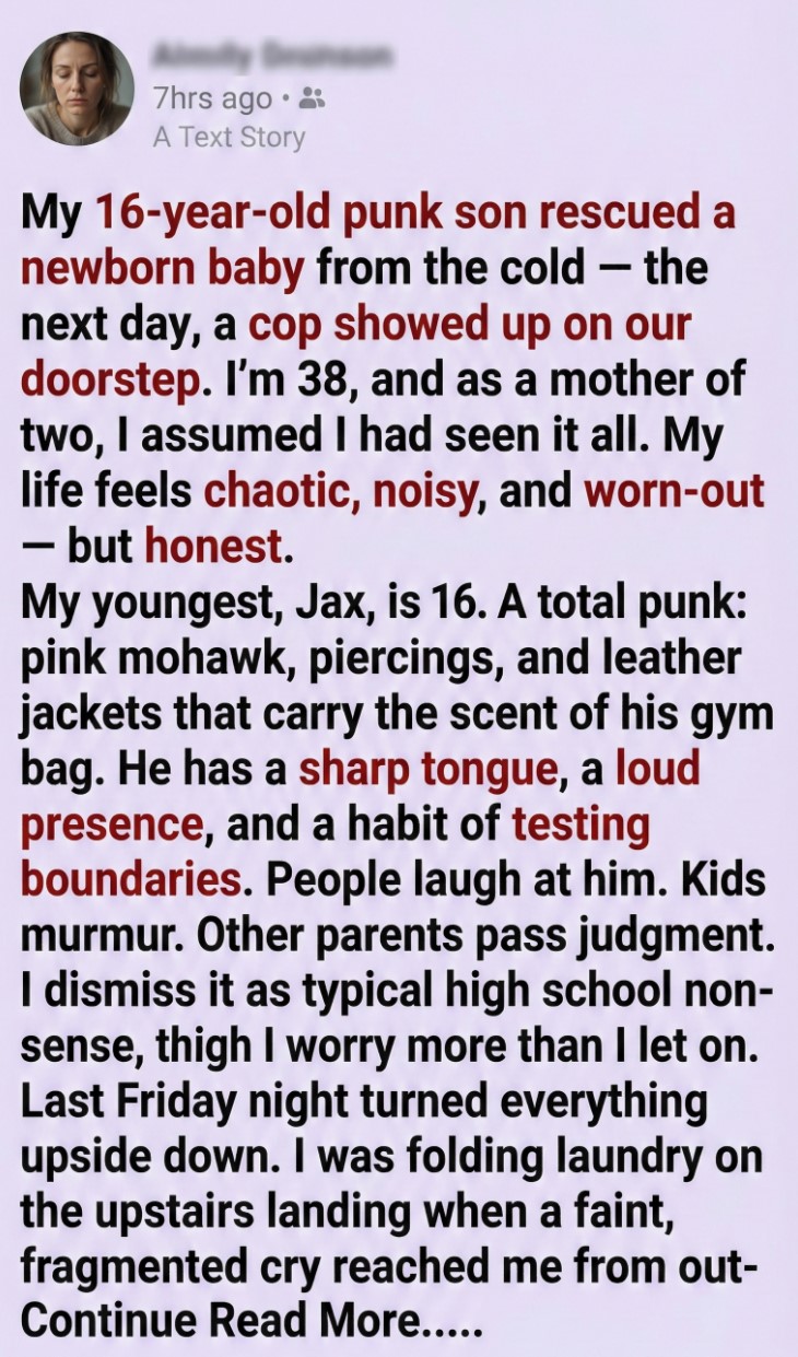 My youngest, Jax, is 16. A total punk: pink mohawk, silver piercings lining his ears, leather jackets that permanently carry the scent of his gym bag. He has a sharp tongue, a loud presence, and a habit of testing every boundary I set. Teachers call him “difficult.” Neighbors call him “trouble.” Other parents pull their kids a little closer when he walks by.