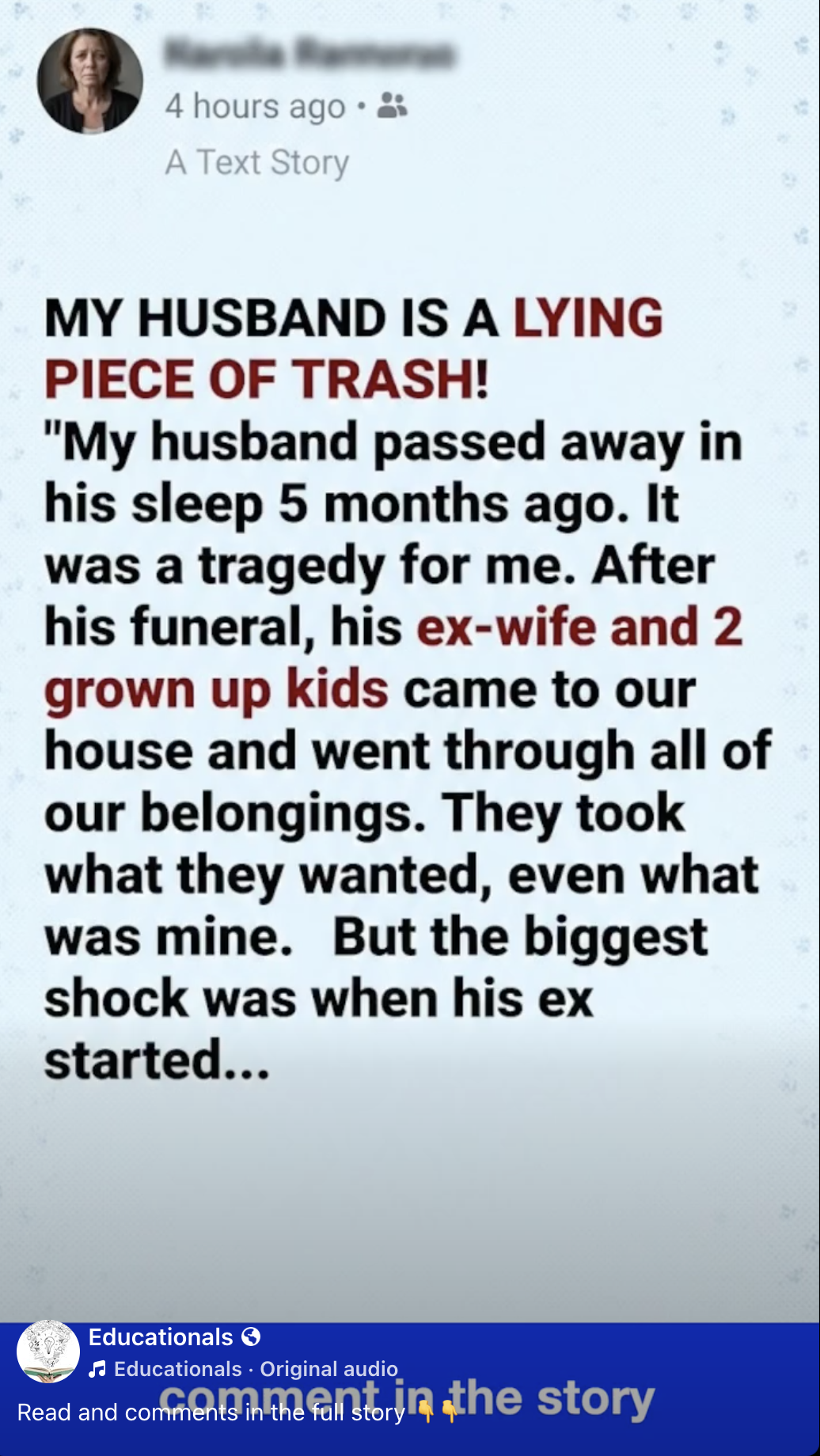 My husband passed away in his sleep 5 months ago. It was a tragedy for me. After his funeral, his ex-wife and 2 grown up kids came to our house and went through all of our belongings. They took what they wanted, even what was mine. But the biggest shock was when his ex started…