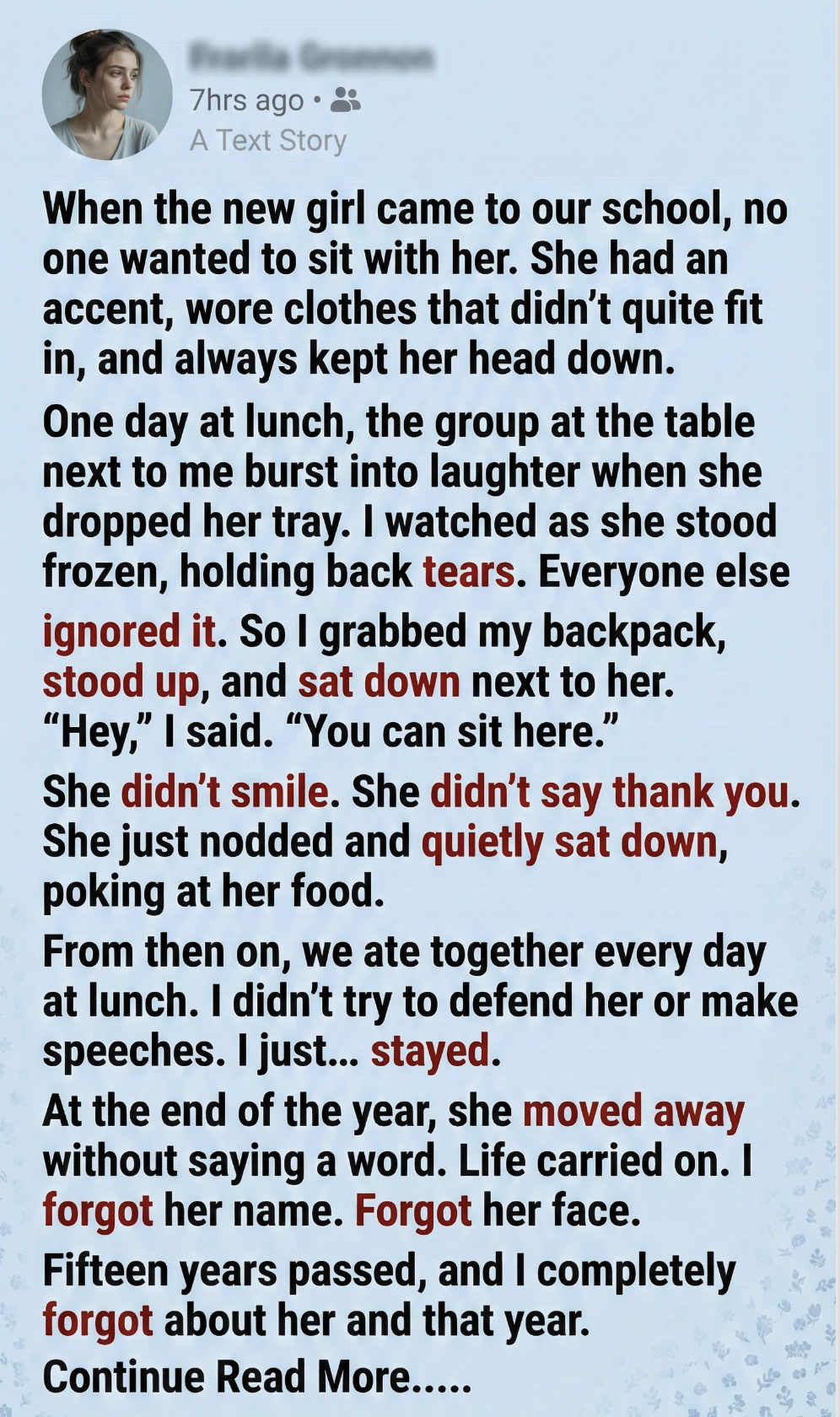 I sat alone at lunch, missing her presence more than I expected. I stared at the empty chair across from me, feeling foolish for being disappointed. “It was just a kid from school,” I told myself.