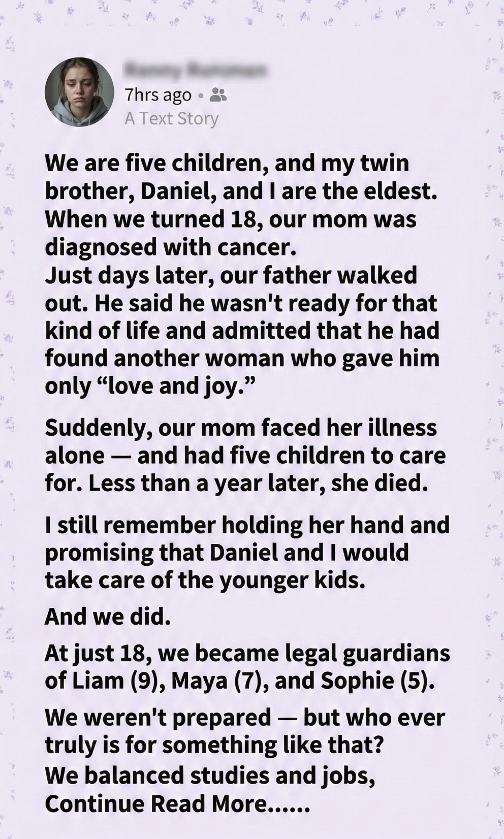 Suddenly, she was facing treatments, hospital visits, and fear — alone. And there were still five of us to raise: Daniel and me, and our younger siblings — Liam, nine; Maya, seven; and Sophie, just five.