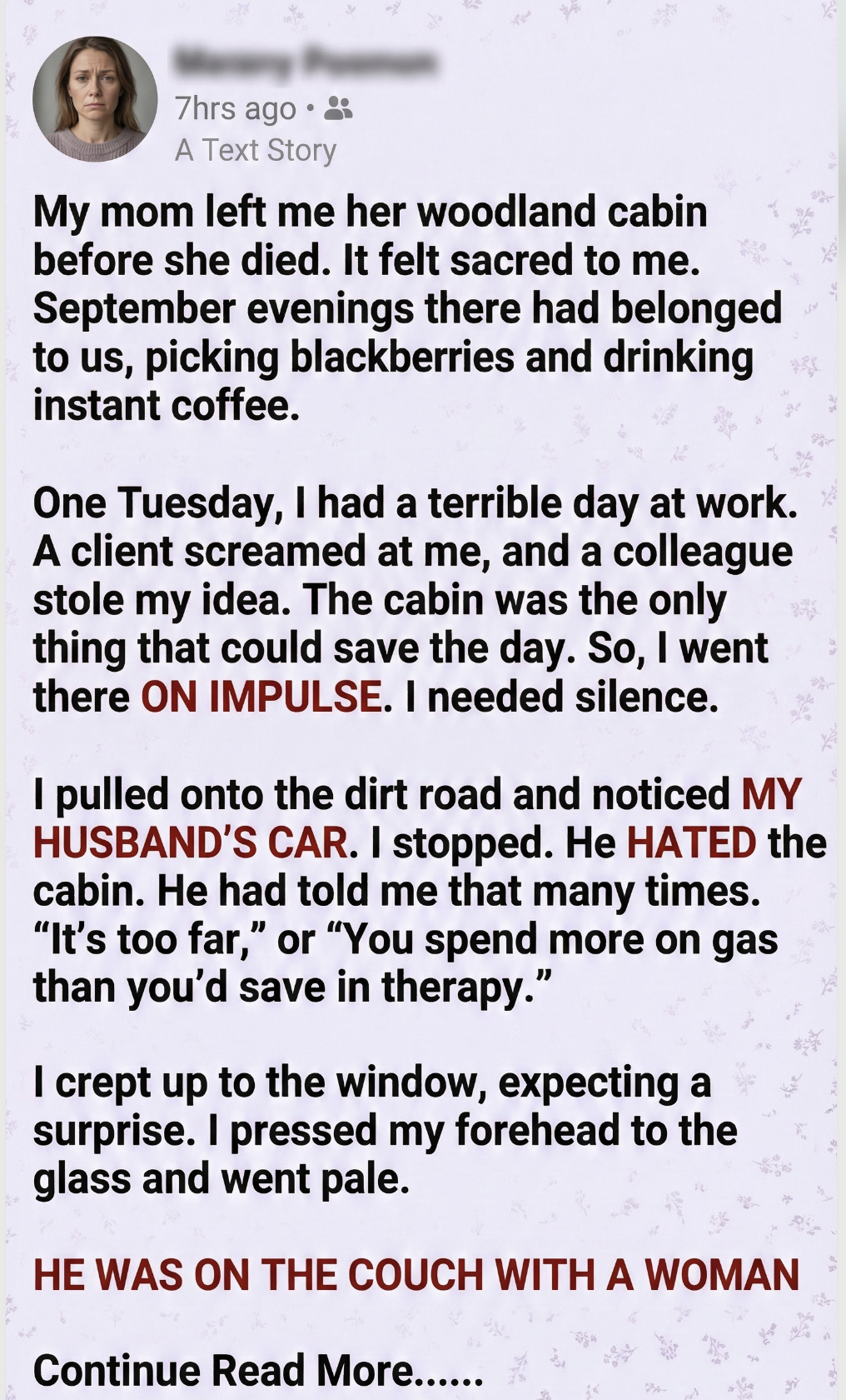 My mom left me her woodland cabin before she died. It felt sacred to me. September evenings there had belonged to us—picking blackberries until our fingers stained purple and drinking instant coffee on the porch while the sun slipped behind the trees. It was the one place where everything felt simple and honest.
