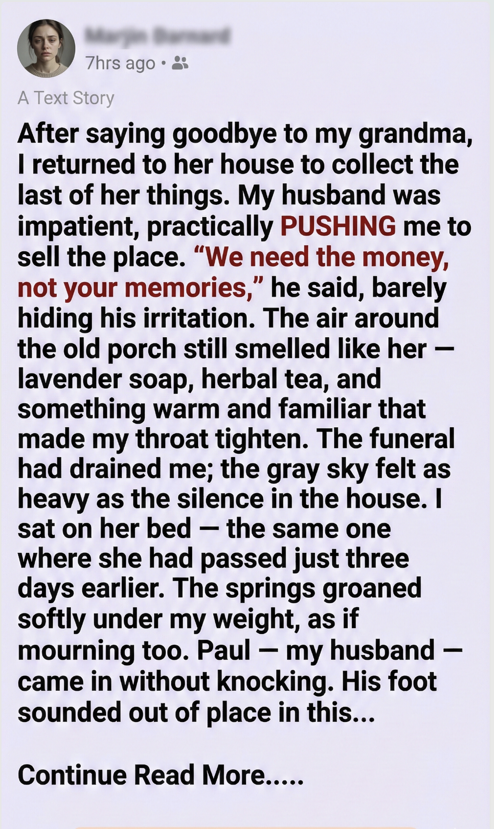 After saying goodbye to my grandma, I returned to her house to collect the last of her things. The funeral flowers were already beginning to wilt, their sweet scent mixing with the familiar smell of her home — lavender soap, herbal tea, and that warm, comforting trace of something that had always meant safety to me.